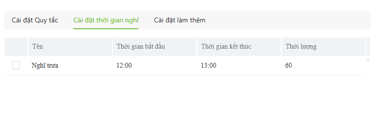 Thời gian nghỉ trưa: bắt đầu nghỉ từ 12h tới 13h (lưu ý: thời gian được cấu hình ở mục thời gian nghỉ)