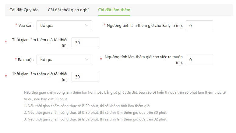 Thời gian làm thêm: công ty tôi không tính nên tôi không thay đổi thông số.