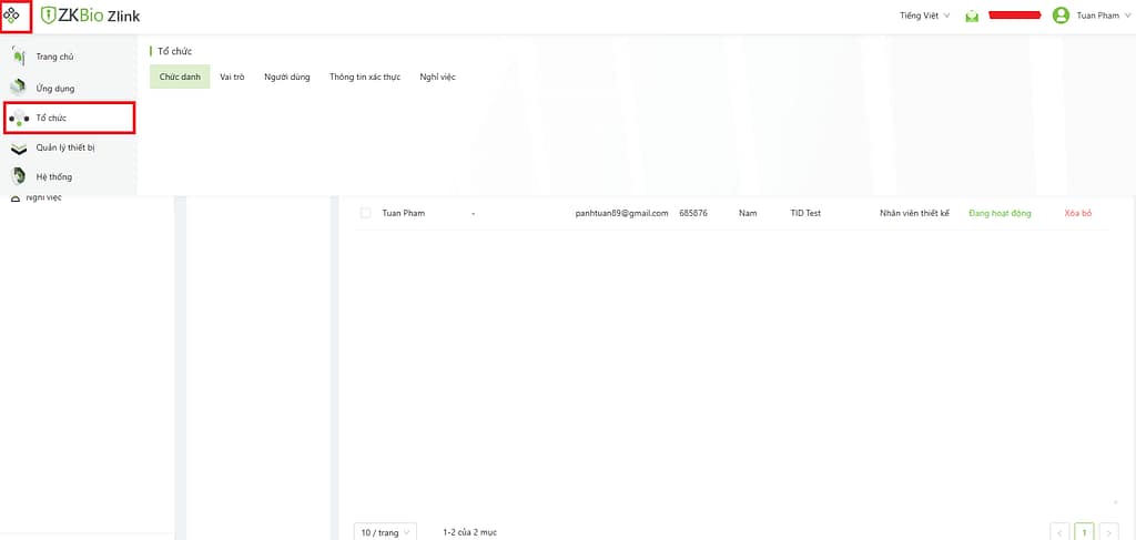 - Chức danh: ở đây thiết lập tổ chức, chức danh của phòng ban, danh sách nhân viên.